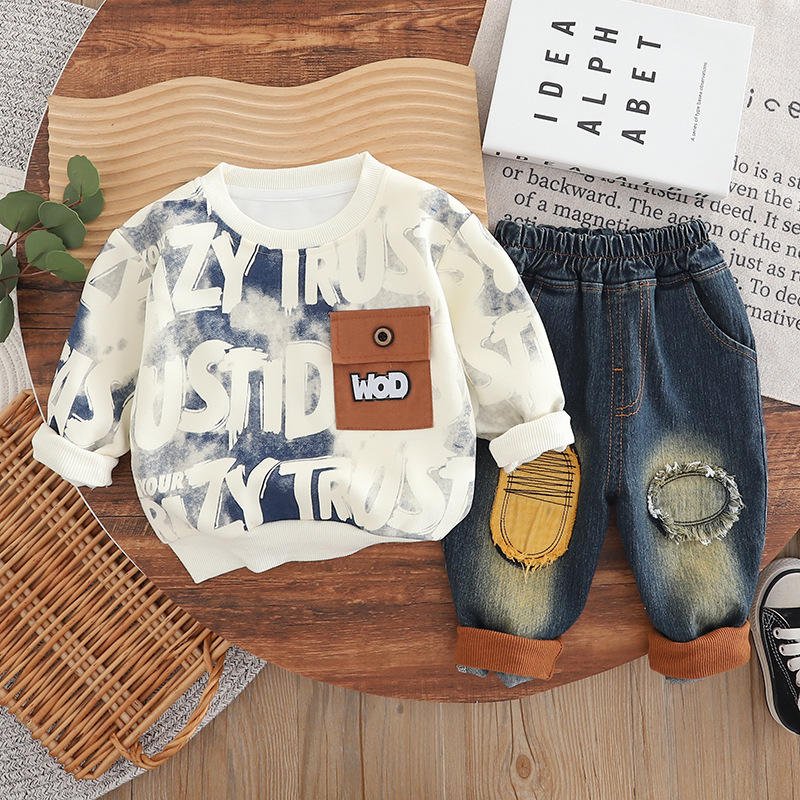 Boys’ Suit Tie-dyed Letter Sweat Ripped Jeans Fashion